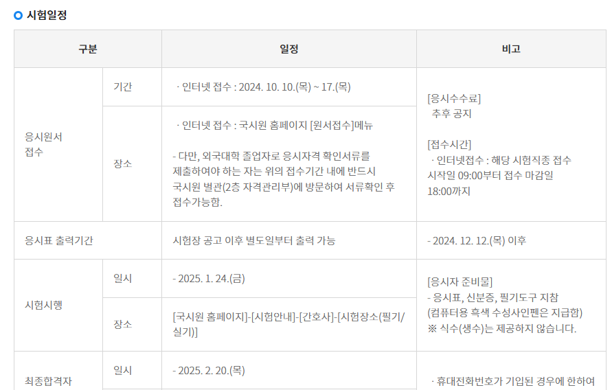 ◼ 응시원서 접수기간 : 2024.10.10.(목) 09:00 ~ 2024.10.17.(목) 18:00시