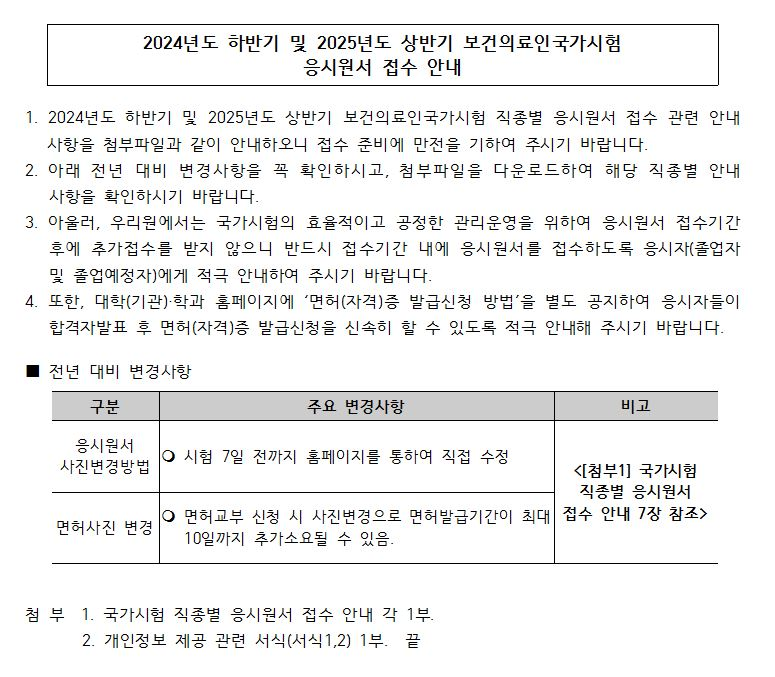 간호학과 학생들께서는 첨부파일 및 한국보건의료인국가시험원 사이트에 공지되어 있는 내용들을 잘 읽고 미리 준비하셔서 응시원서 접수 및 응시료 결제를 기한 전까지 끝내주시고 전년 대비 변경사항도 잘 확인 바랍니다.