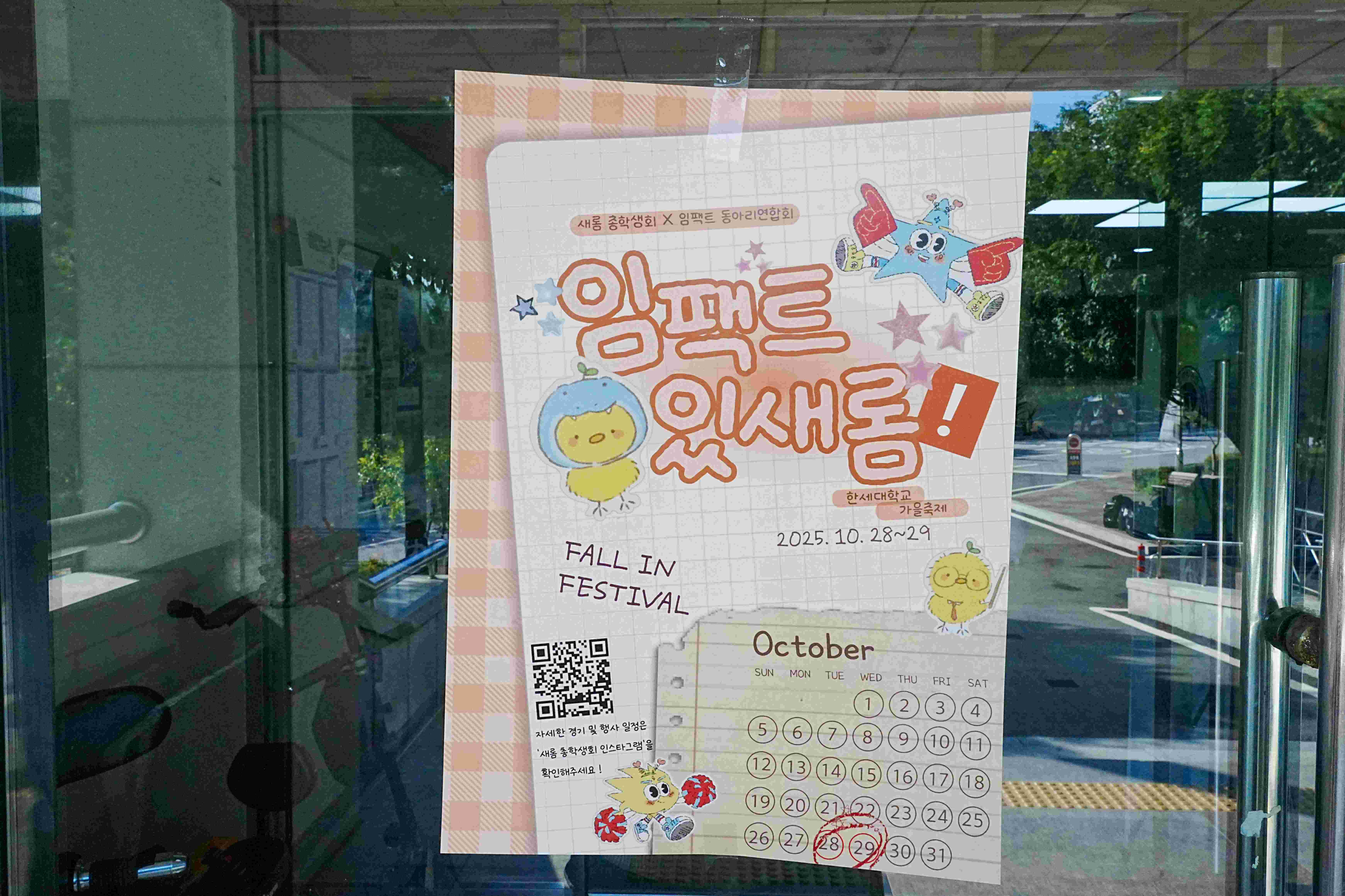 제72대 새롬 총학생회와 제36대 Impact 동아리연합회가 공동으로 주관하는 가을 축제 는 ‘임팩트 있새롬!’이라는 이름으로 DMZ, 비랩, 치즈스틱 등의 동아리 무대와 ‘성령의 밤’ 행사로 다양한 먹거리 푸드존이 함께 운영되었다.