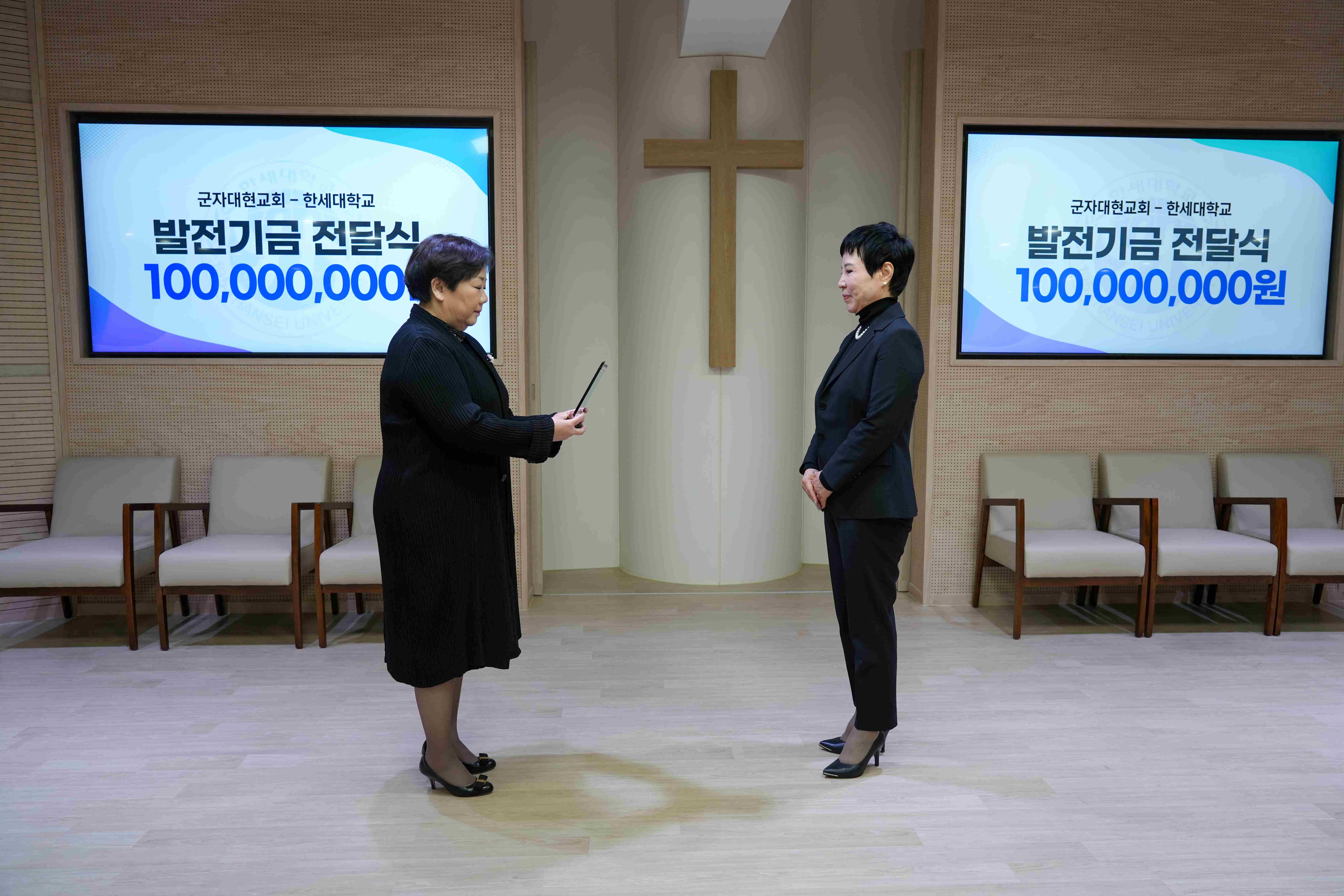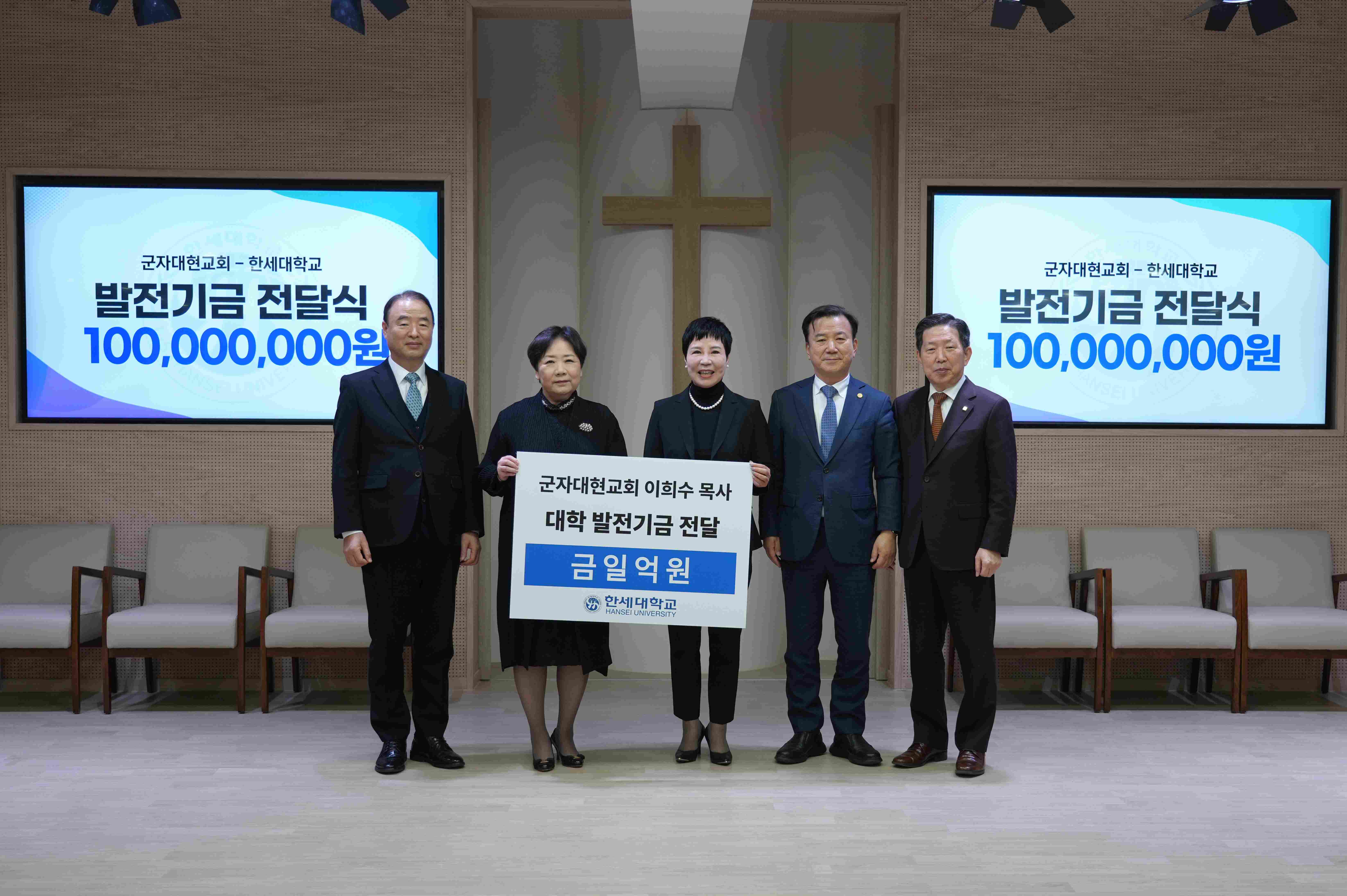 한세대학교(총장 백인자)는 대외협력처 주관으로 기독교대한하나님의성회 시흥 군자대현교회(담임 이희수 목사)가 기부자로 참여하는 발전기금 전달 및 감사패 증정 행사를 11일 예루살렘홀에서 진행된 교직원 예배에 이어서 진행하였다.
