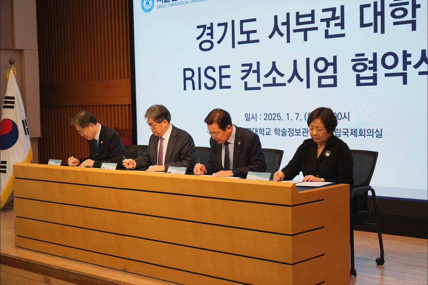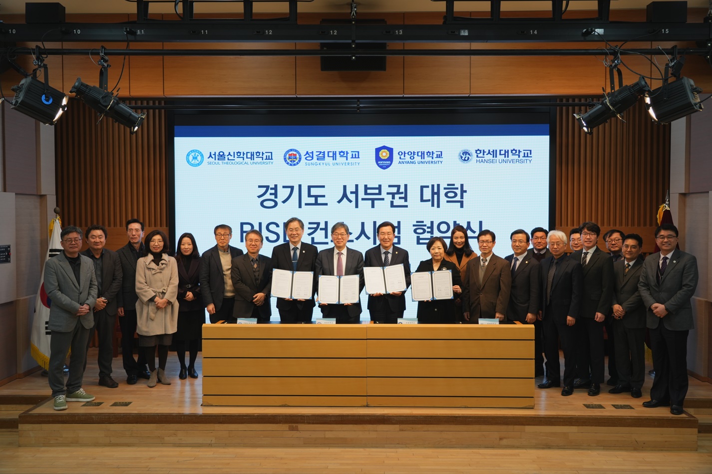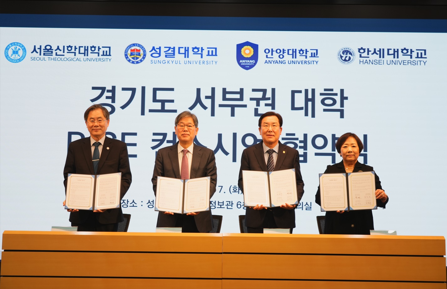 성결대 야립국제회의실에서 진행된 컨소시엄 협약 체결식에는 ▲한세대 백인자 총장, 최진탁 부총장, 유대현 부총장, 윤현철 기획처장 ▲성결대 김상식 총장, 이은성 부총장, 정희석 부총장, 임태수 기획처장, 라휘문 미래사업추진실장 ▲안양대 장광수 총장, 양재수 부총장, 박남훈 기획처장 ▲서울신학대 황덕형 총장, 조성호 기획처장 등이 참석했다.