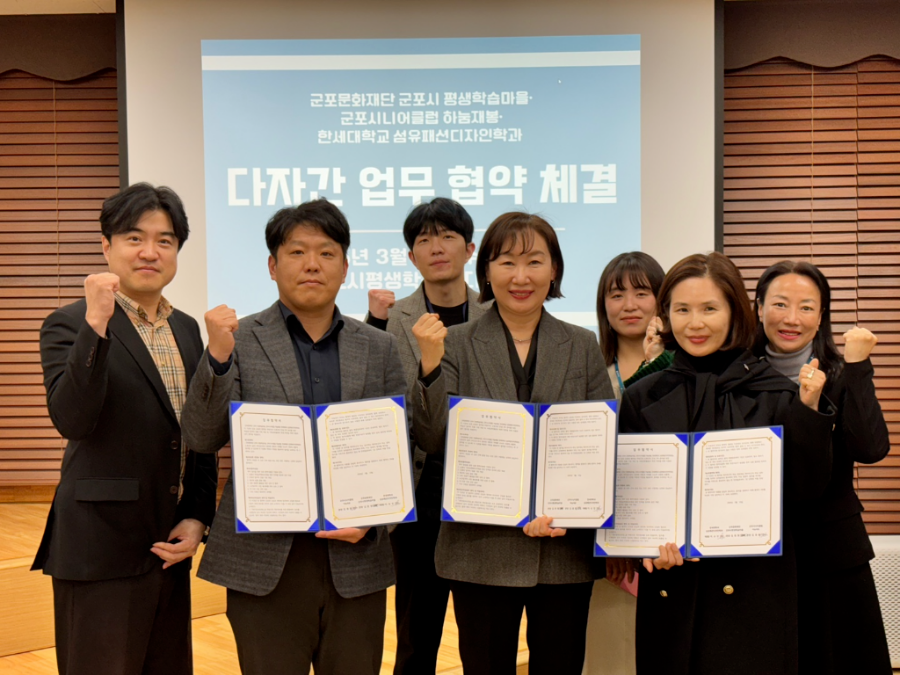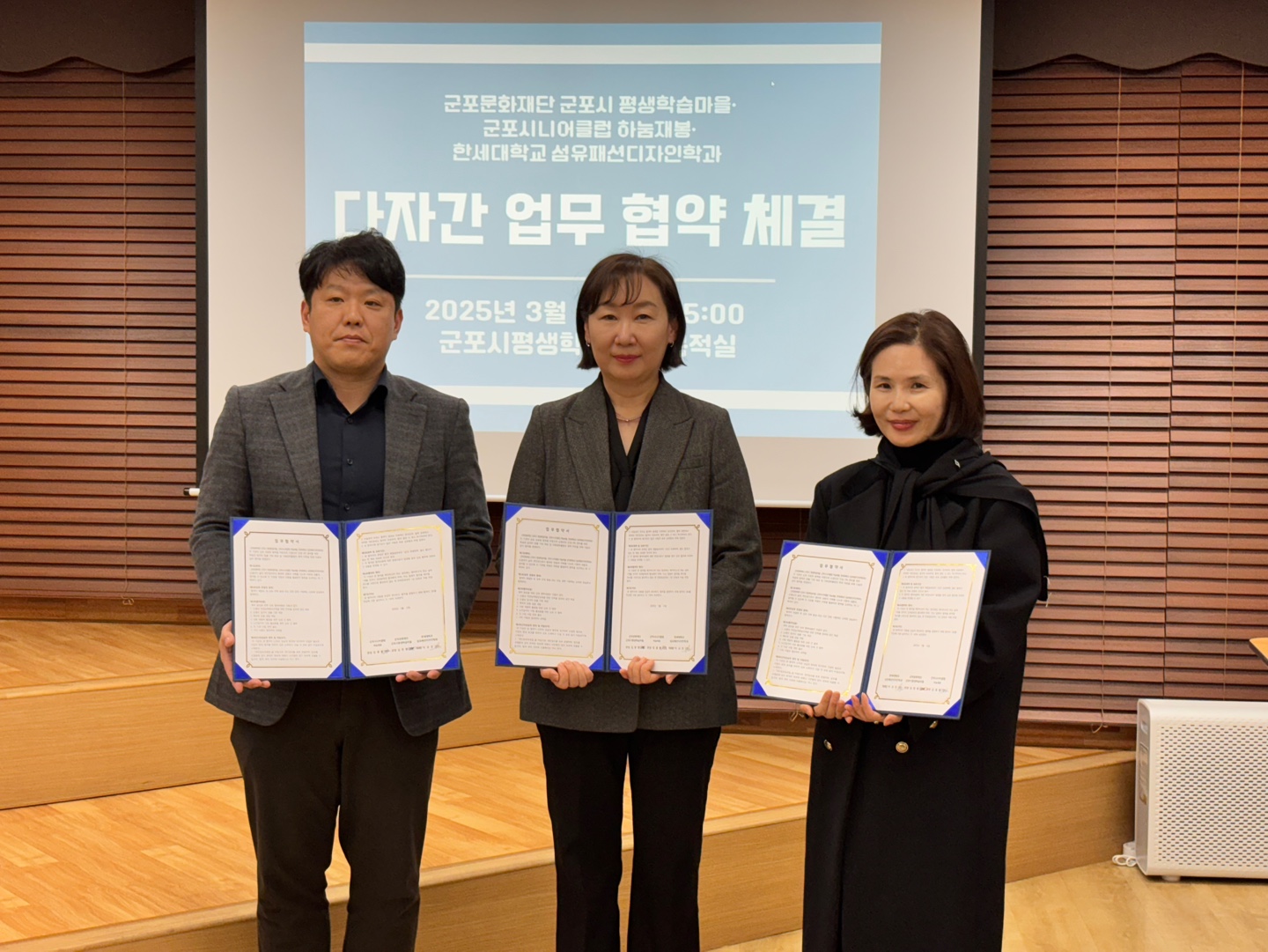 지역사회 신중년 및 노인 세대의 인생 2막 준비를 위한 역량강화교육과 일자리 창출 사업 활성화를 위해 군포문화재단 군포시 평생학습마을 다목적실에서 12일 진행된 협약식에는 한세대학교 섬유패션디자인학과 이규진 학과장과 군포문화재단 군포시평생학습마을 김현량 관장, 군포시니어클럽 하눔재봉 김종철 관장 등이 참석했다.