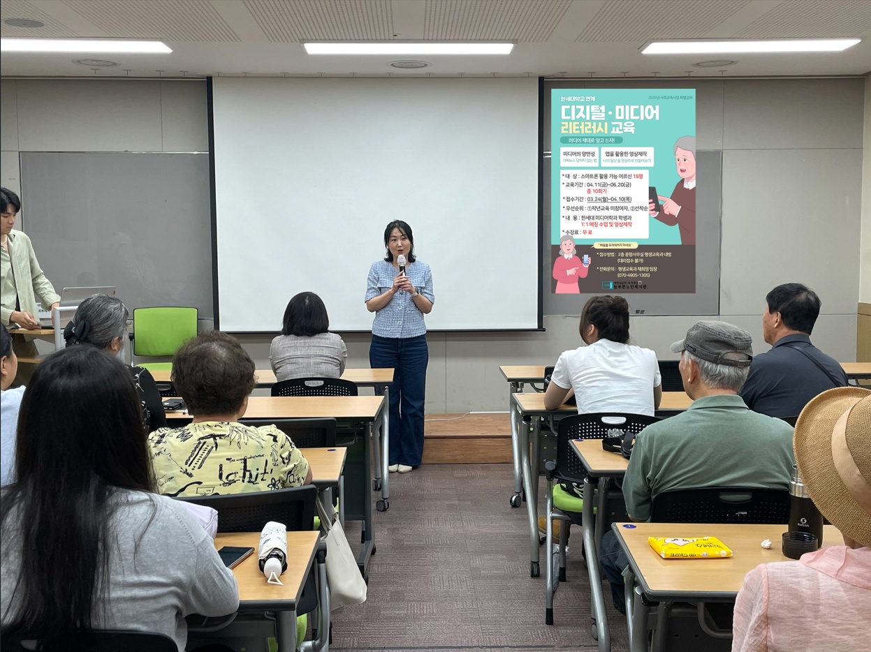미디어 리터러시(media literacy) 교육은 학습자가 미디어를 이해하고 활용하는 능력을 학습하는 것으로 한세대학교 홍숙영 교수가 군포시늘푸른노인복지관에서 강의한 ‘미디어 리터러시 교육’은 노년 세대의 미디어에 대한 요구와 필요에 맞는 맞춤형 서비스러닝 방식으로 10주간 수업을 학과 학생들과 함께 시니어 회원들을 대상으로 진행하였다.