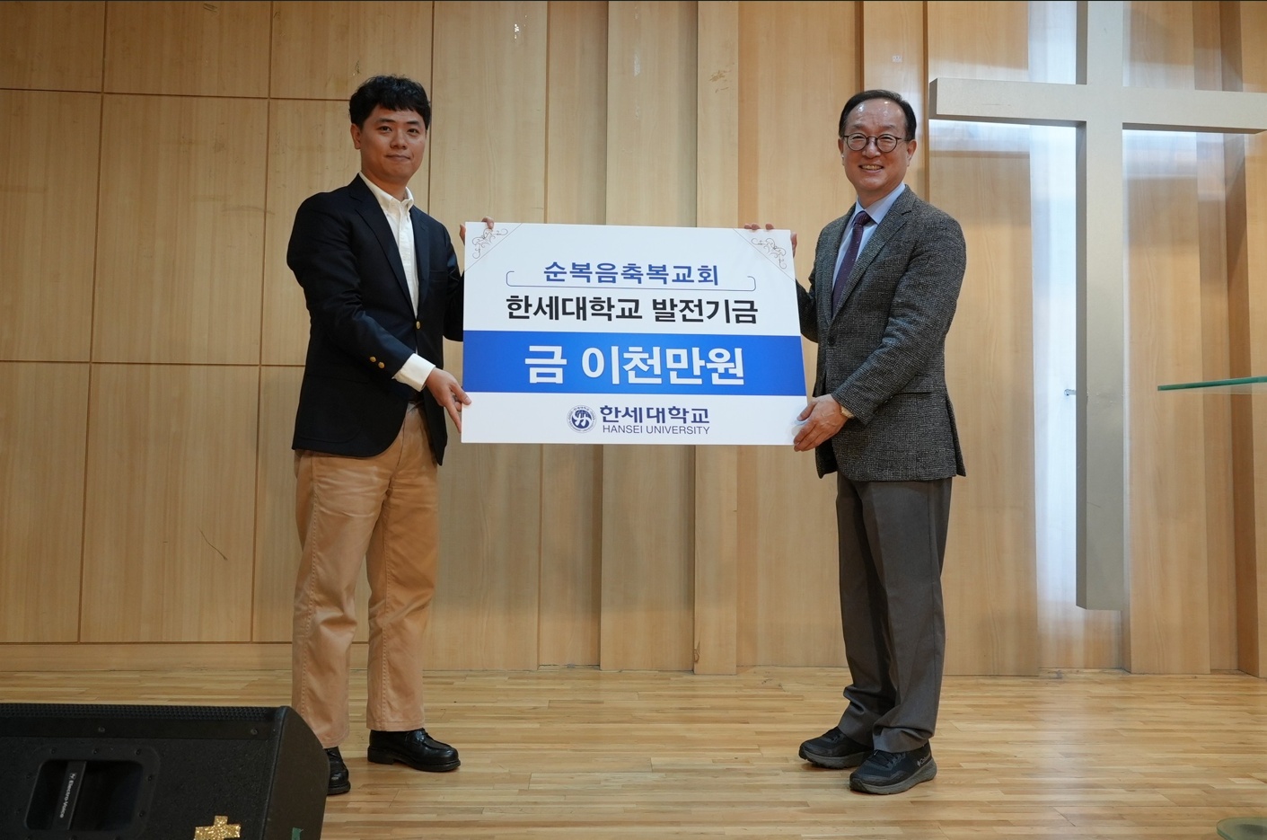 이날 발전기금 전달식은 순복음축복교회가 한세대학교 교육 환경 개선 사업을 위해 신학관 204호 세미나실 리모델링을 위한 지정 발전 기금으로 2천만원을 기부한 것을 기념하여 진행된 것으로 기부자를 대표한 오영대 목사가 후원 금액이 표기된 폼포드 판넬을 학교를 대표한 차준희 대학원장에서 전달했고 학교 구성원을 대표하여 차준희 대학원장은 기부자 대표 오영대 목사에게 감사장과 기부자 예우 선물을 전달하였다.