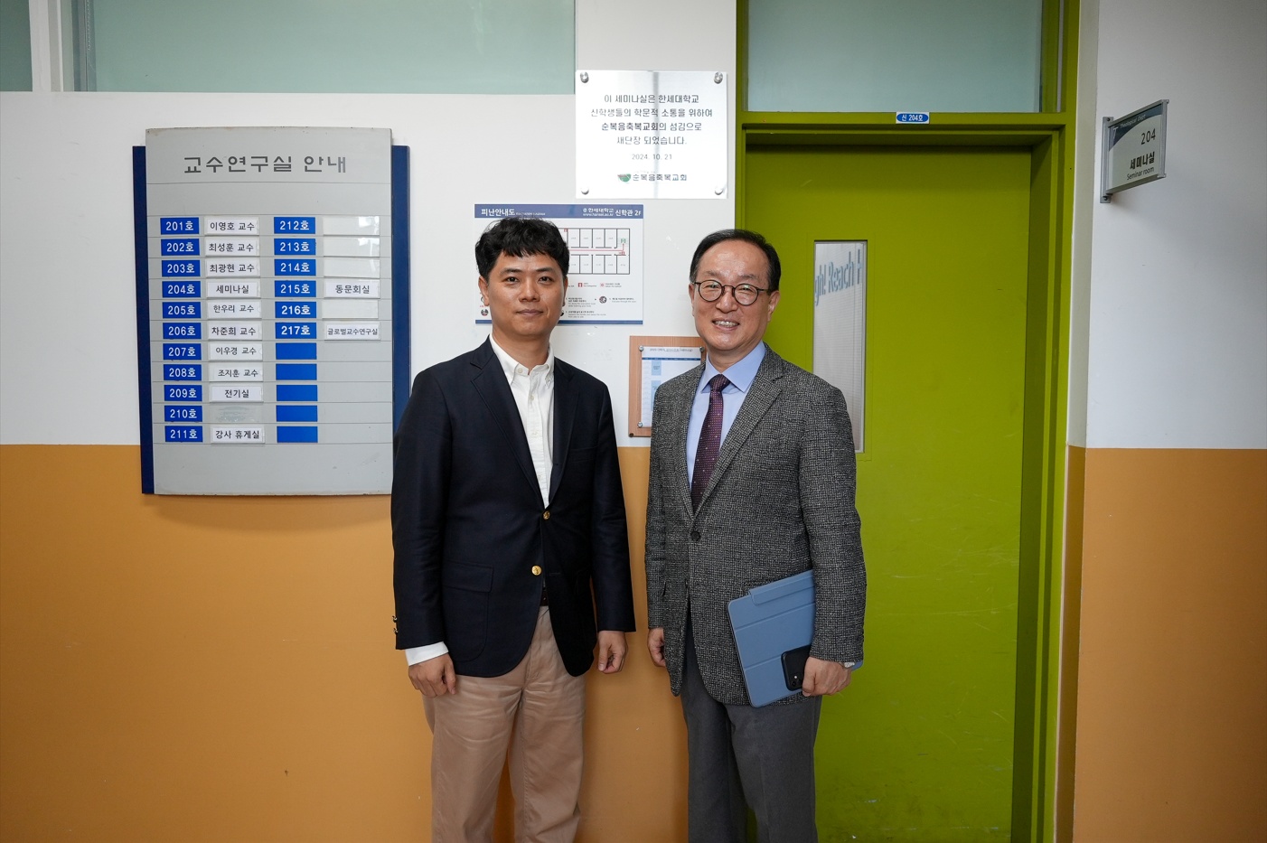 [사진 3. 순복음축복교회 발전기금 후원으로 조성된 신학관 세미나실 204호 기념사진1] - 좌측부터 오영대 목사, 차준희 대학원장
