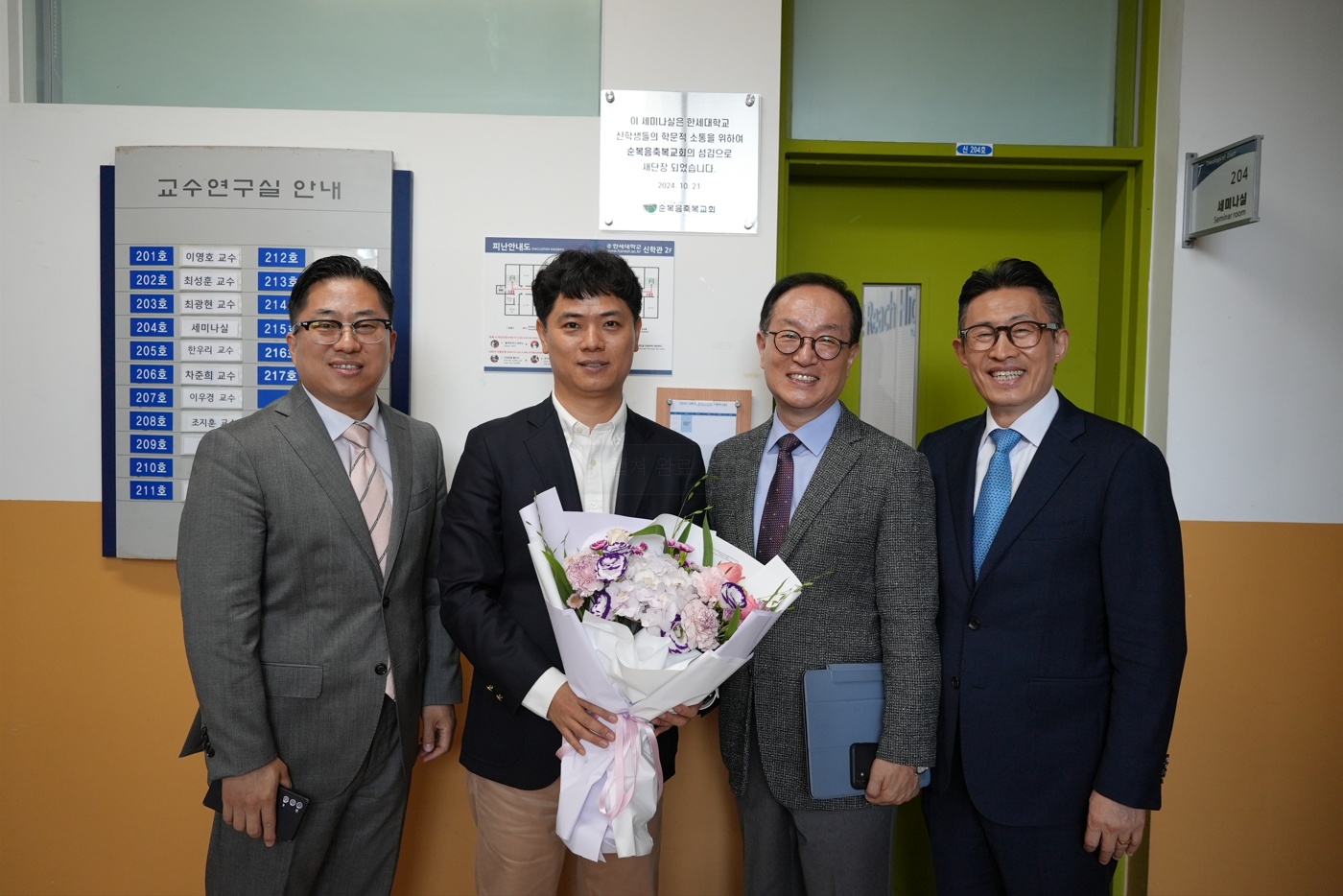 [사진 4. 순복음축복교회 발전기금 후원으로 조성된 신학관 세미나실 204호 기념사진1] - 좌측부터 최성훈 대외협력부처장, 오영대 목사, 차준희 대학원장, 조지훈 교목실장