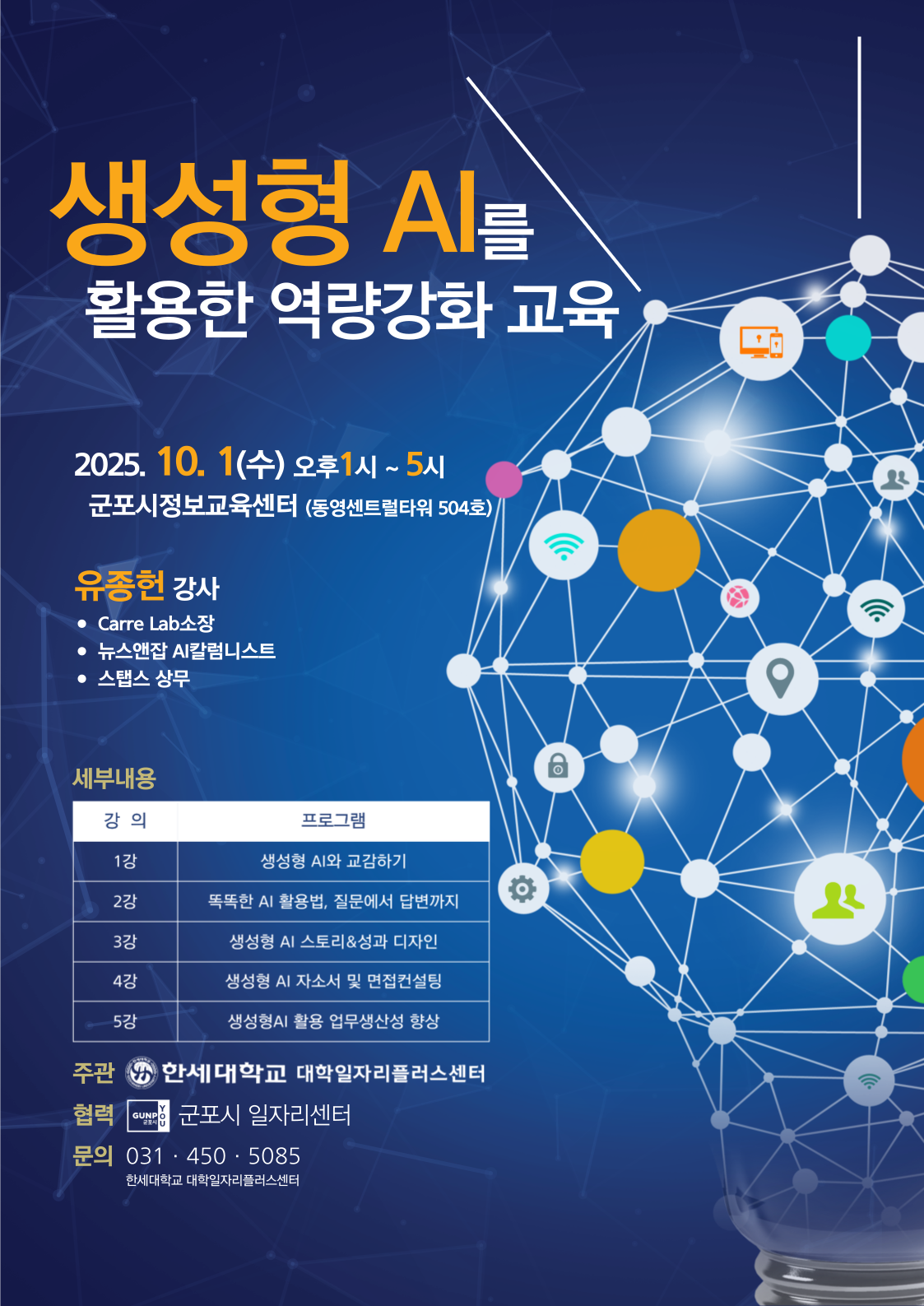 한세대학교(총장 백인자)는 대학일자리플러스센터(센터장 장남경)가 주관으로 군포시 일자 리센터와 연계하여 지역사회 공무원과 대학 교직원을 대상으로 업무 생산성 향상을 위해 ‘생 성형 AI를 활용한 역량 강화 교육’을 군포시 정보교육센터에서 1일 개최하였다.