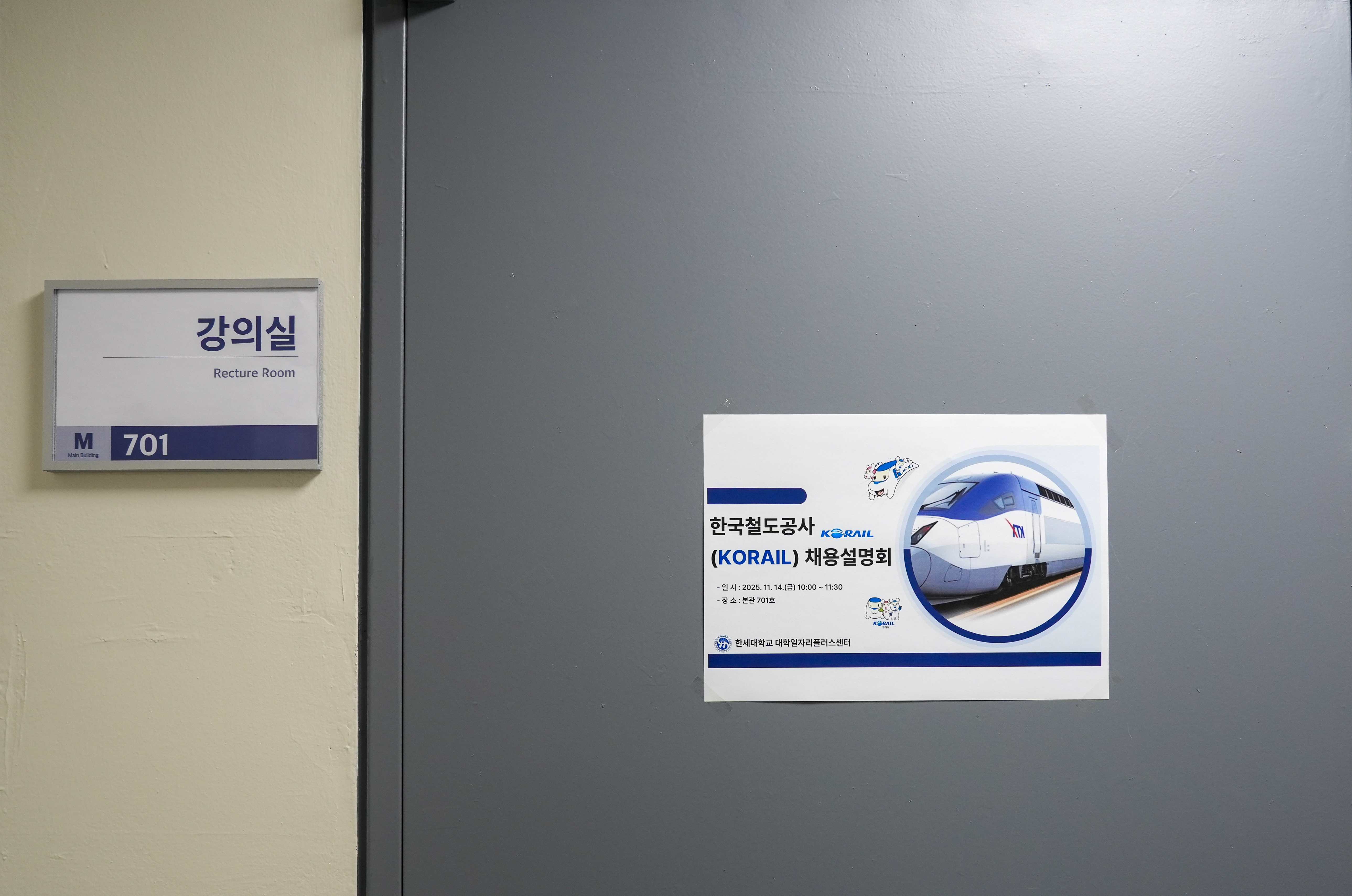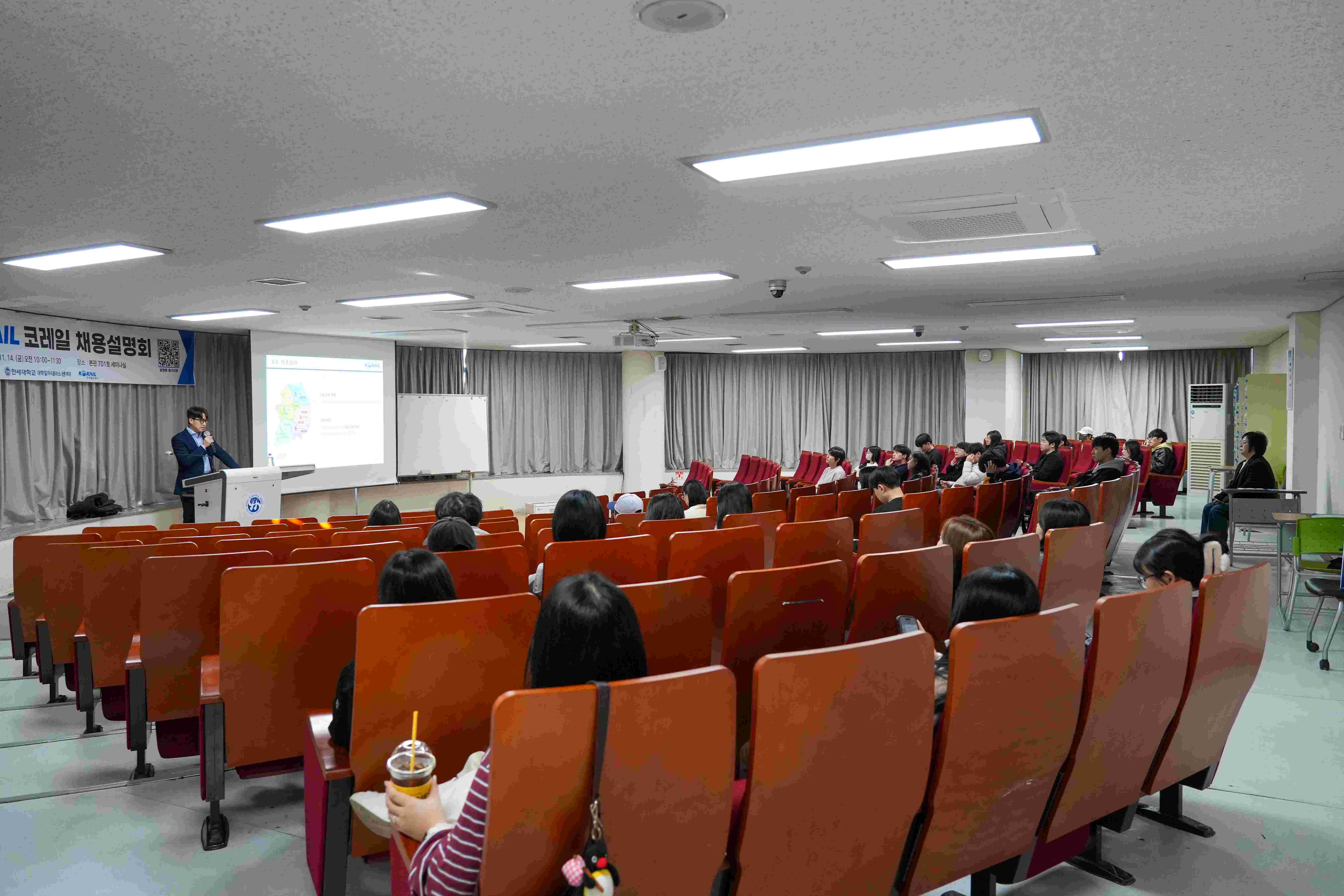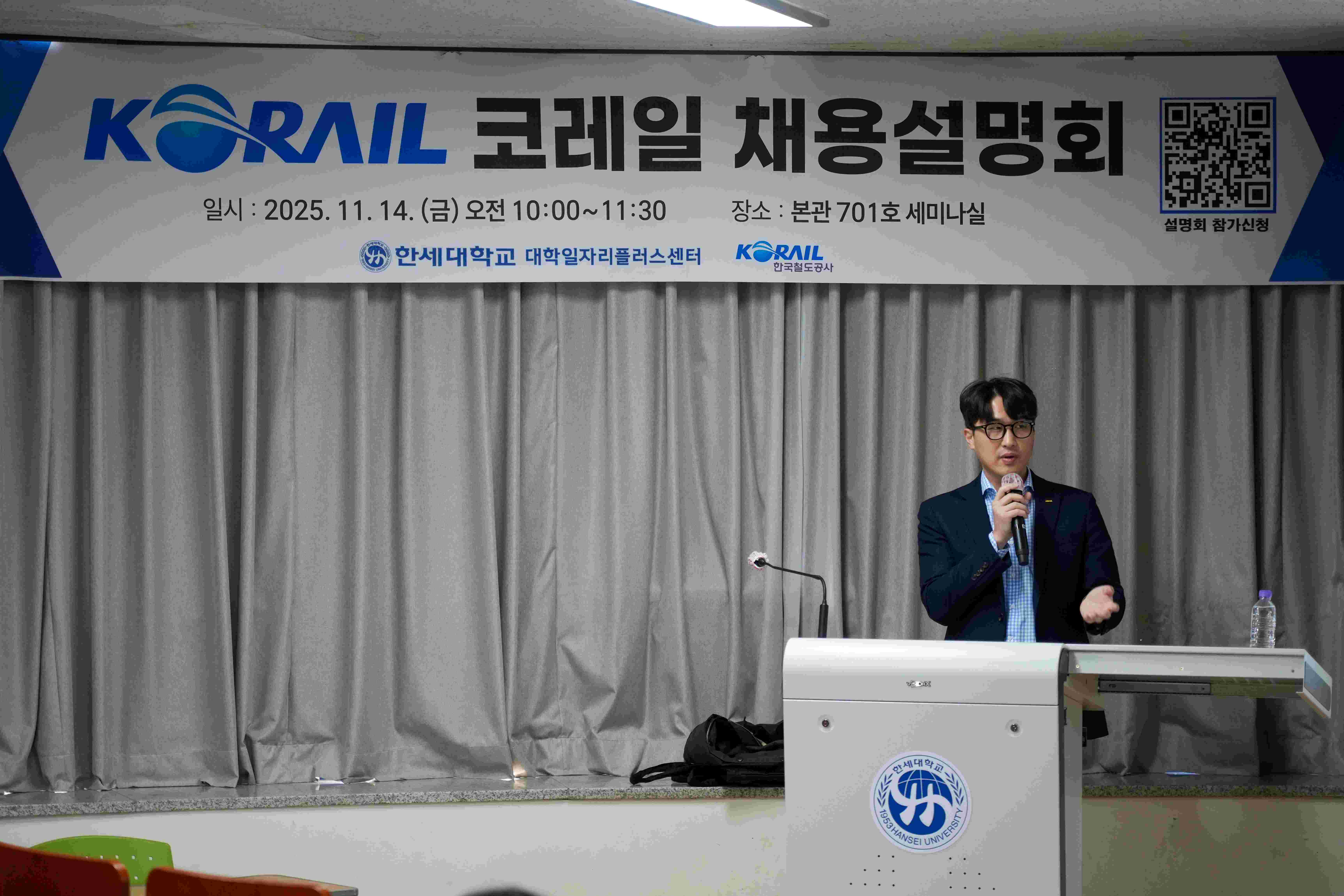 이날 채용 설명회에서는 코레일(한국철도공사) 인사 담당자(과장 박대현)가 ▲2025년 하반기 코레일(한국철도공사) 신입사원(토목, 전기통신 분야) 채용 설명 ▲2026년 코레 일(한국철도공사) 채용형 인턴 신입사원 채용계획에 대하여 안내했다.