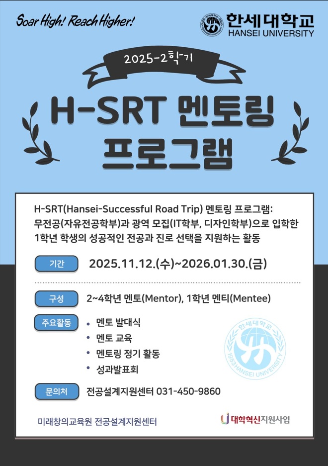 한세대학교(총장 백인자)는 미래창의교육원 전공설계지원센터를 중심으로 무전공(자유전공학부)과 광역 모집(IT학부, 디자인학부)으로 입학한 1학년 학생의 전공 선택권을 강화하기 위해 ‘2025 H-SRT 멘토링 프로그램’을 11월부터 2026년 1월까지 운영한다고 발표했다.