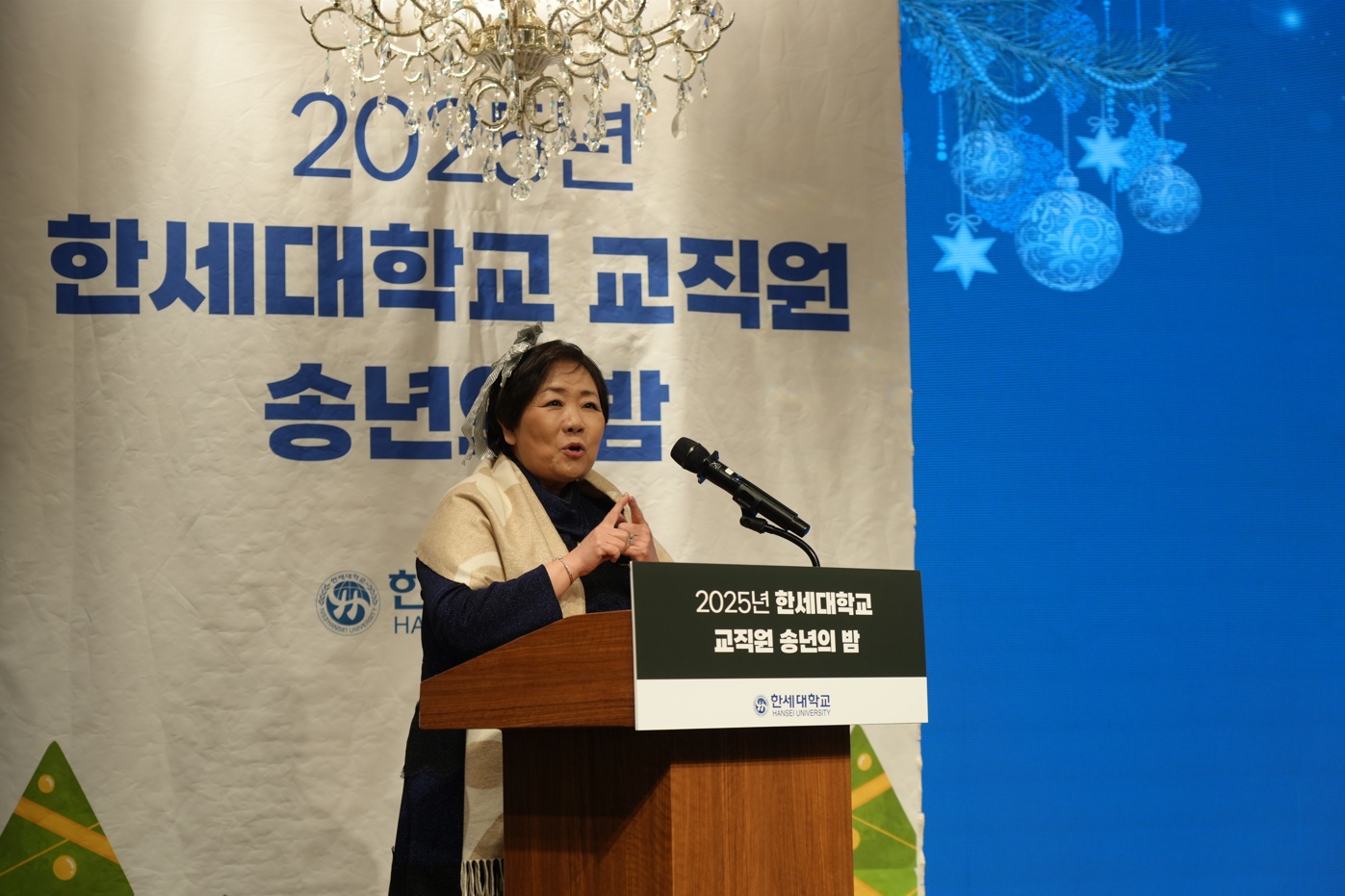 [사진 2. 2025년 교직원 송년의 밤 행사를 소감을 밝히는 백인자 총장]