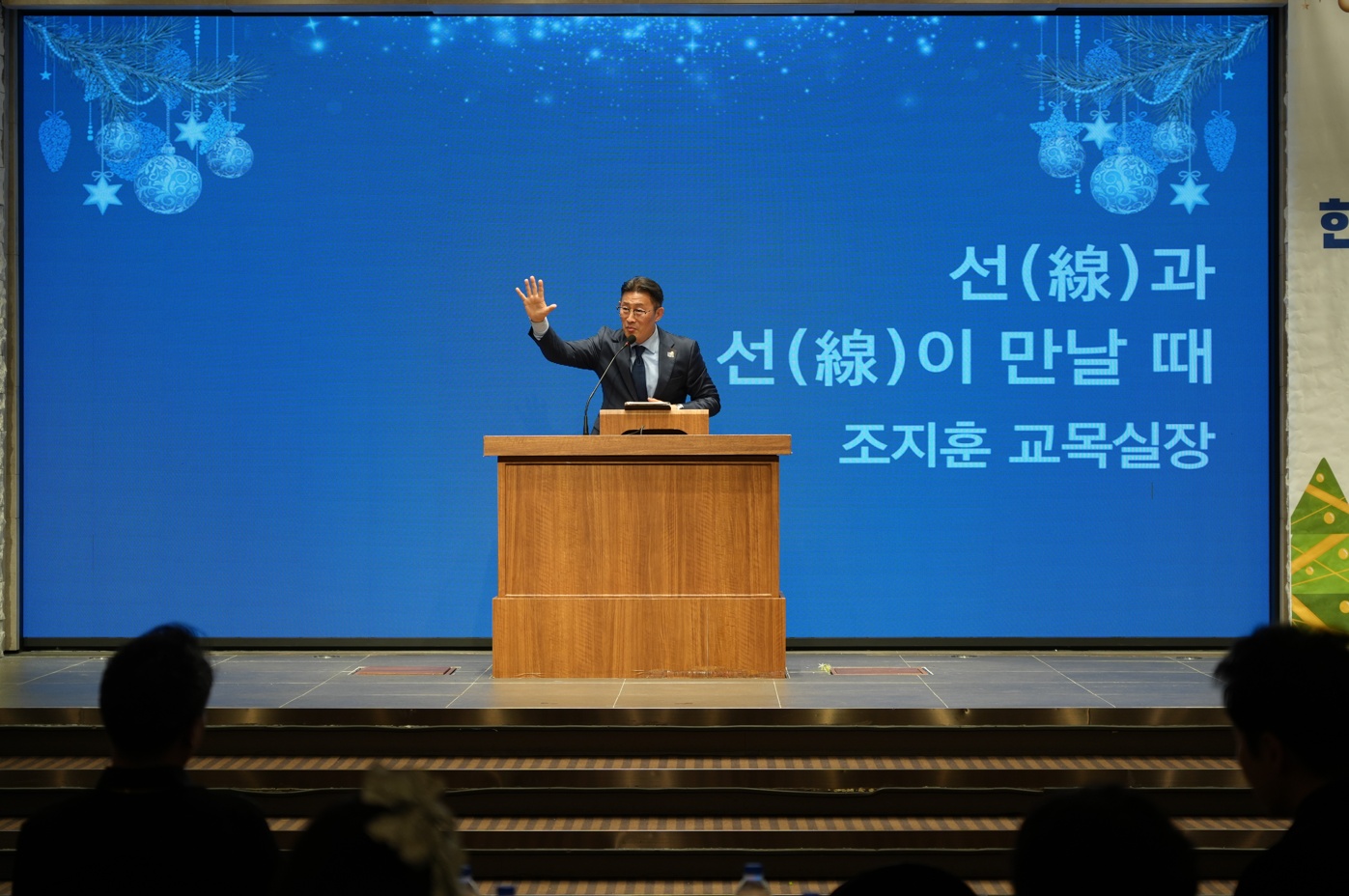 [사진 6. 2025년 교직원 송년의 밤 행사 중 설교를 전하는 조지훈 교목실장]