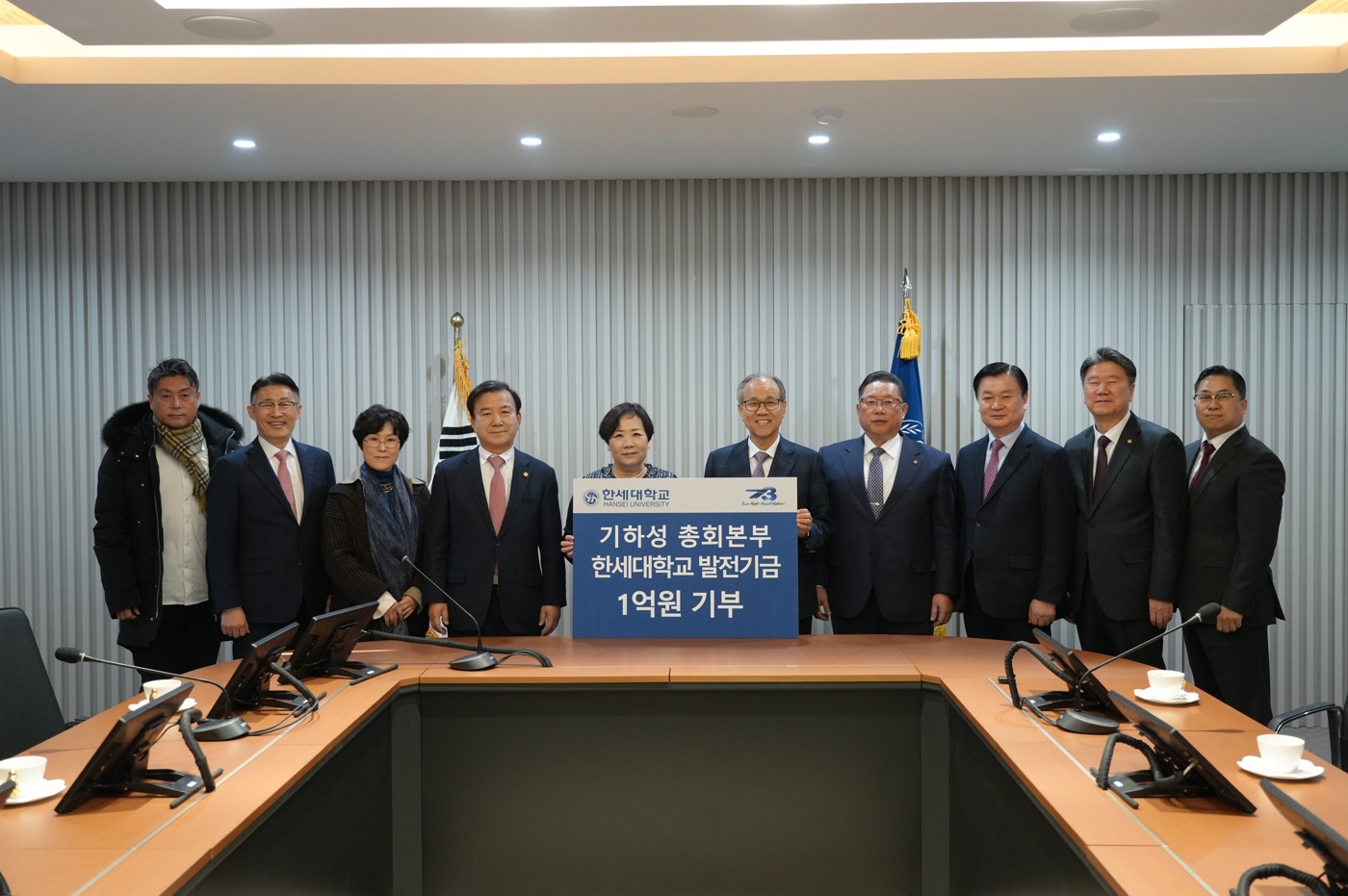 기부자를 대표하여 정동균 총회장은 기하성 총회본부가 한세대학교 학교 발전을 위한 일반 발전 기금으로 지난 12월 1억원 입금한 것을 기념하여 후원 금액이 표기된 판넬 을 학교를 대표한 백인자 총장에게 전달했고 학교 구성원을 대표하여 백인자 총장은 기부자 대표 정동균 총회장에게 감사패와 기부자 예우 선물을 전달하였다.