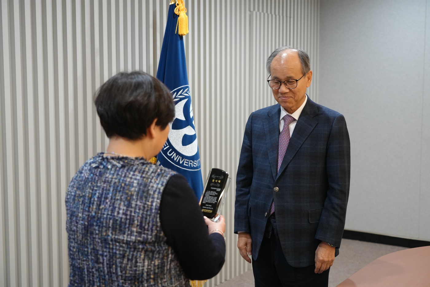 [사진 5. 발전기금 전달식 행사에서 감사패 증정 순서 1] 정동균 총회장에게 감사패를 증정하는 백인자 총장