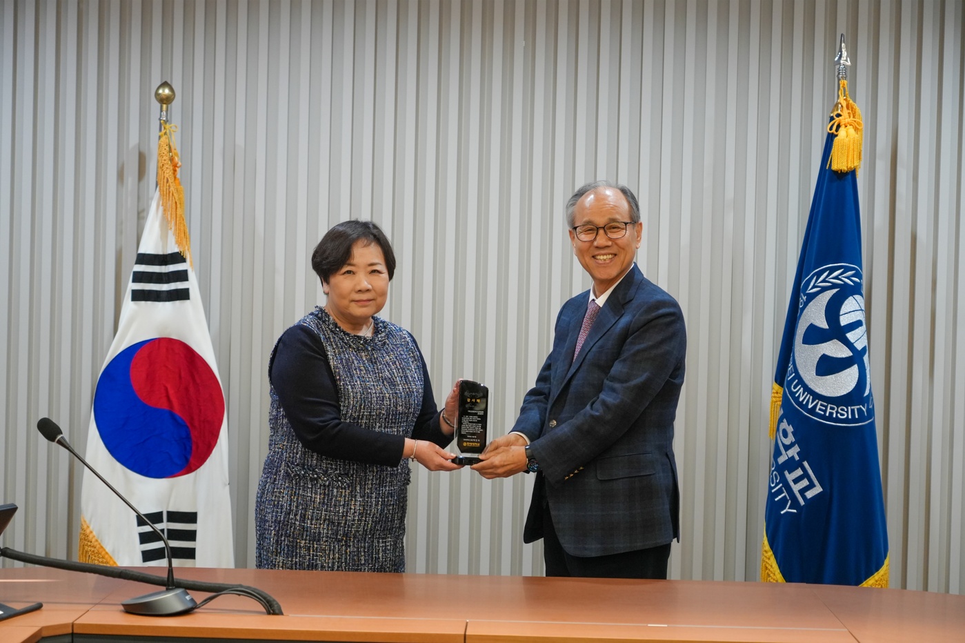 [사진 6. 발전기금 전달식 행사에서 감사패 증정 순서 2] 좌측부터 백인자 총장, 정동균 총회장