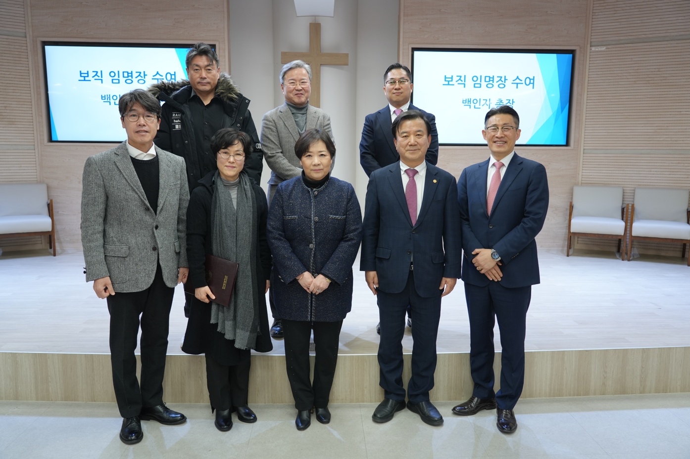 [사진 6. 신임 부총장 임명장 수여 후 기념사진 3] 좌측 2열부터 조재혁 학생처장, 노기선 행정처장, 최성훈 대외협력부처장 좌측 1열부터 윤현철 기획처장, 임은영 부총장, 백인자 총장, 최진탁 부총장, 조지훈 교목실장