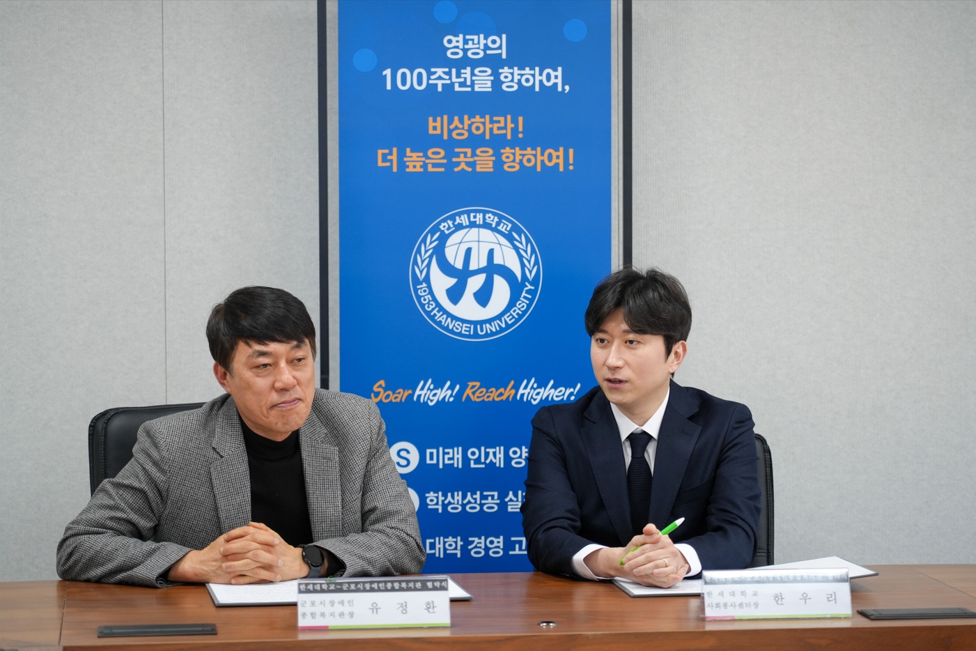 [사진 5. 업무협약과 관련하여 인사말을 하는 양 기관 대표자] 좌측부터 군포시장애인종합복지관 유정환 관장, 한세대학교 사회봉사센터 한우리 센터장