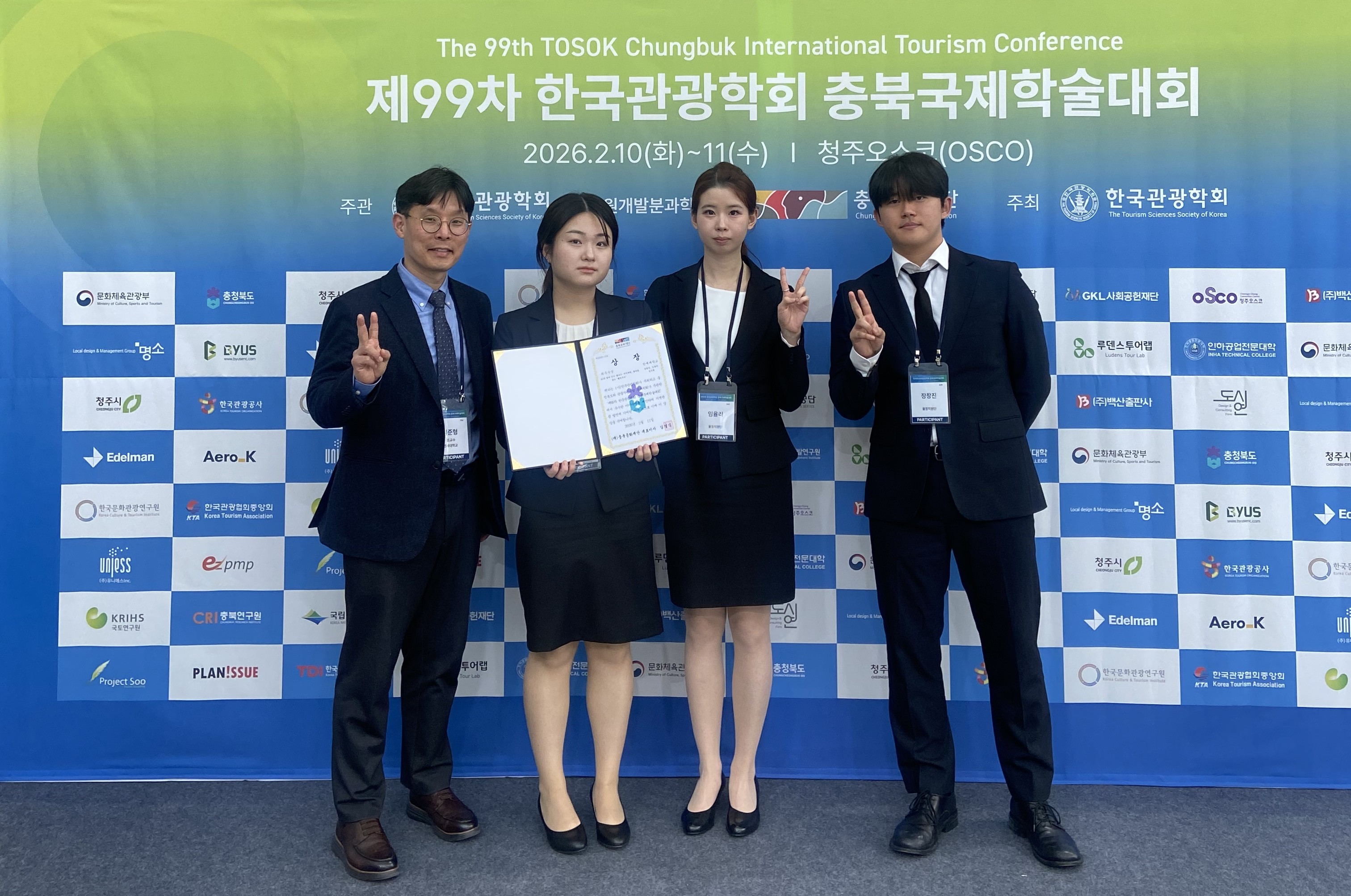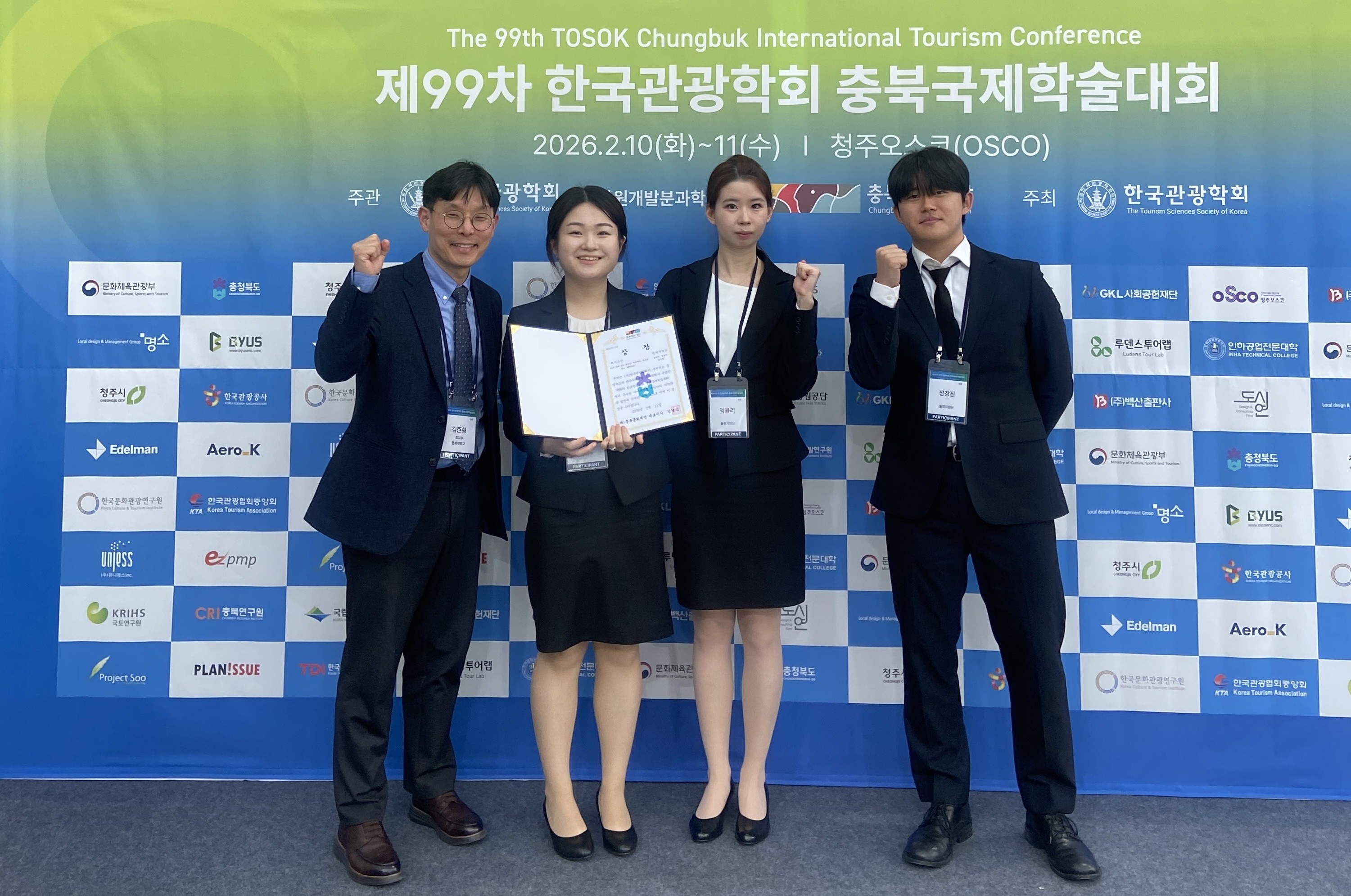 지도를 맡은 김준형 교수는 “학생들과 공모전을 준비하는 과정이 쉽지 않았지만, 관광학 분야에서 권위 있는 한국관광학회 국제학술대회에서 좋은 성과를 거두게 되어 매우 뜻깊게 생각하며 끝까지 최선을 다해준 학생들이 자랑스럽다”라고 말했다.