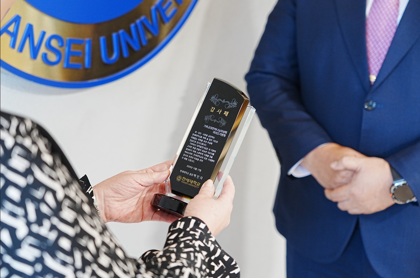[사진 4. 발전기금 전달식 행사 중 감사패 배경 기념사진 2]