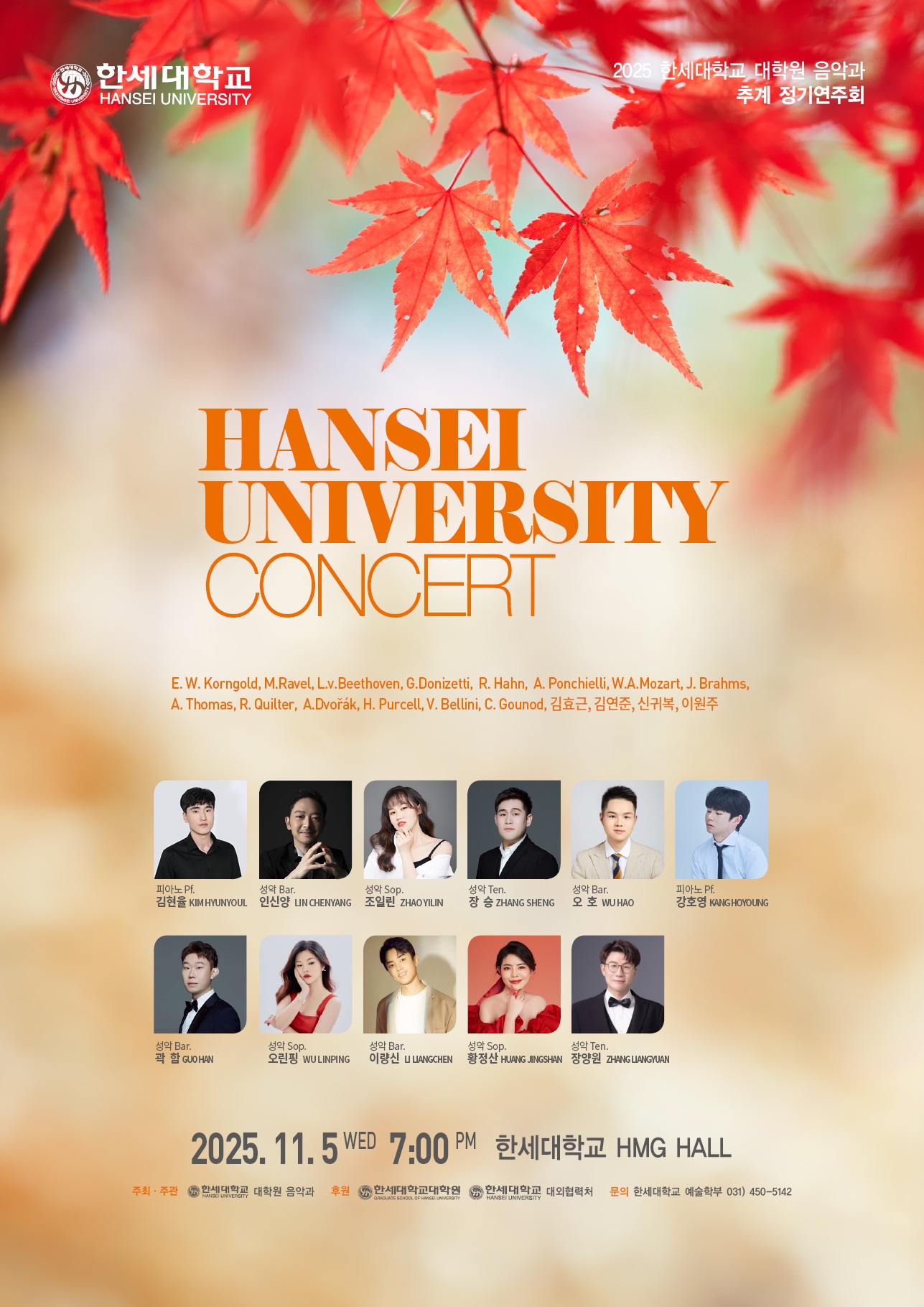 2025학년도 대학원 음악과 추계 정기연주회는 ▲피아노 전공, 석사 1학차 김현율이 베 토벤의 Piano Sonata No.17 in D minor, Op.31 No.2 ‘Tempest’, 석사 1학차 강호 연이 브람스의 Piano Sonata No.3 in F minor, Op.5 중 2악장 ‘Andante espressivo’, ▲성악 전공, 박사 3학차 인신양(LIN CHENYANG)이 코른골트의 오페라 ‘Die tote Stadt’ 중 〈Mein Sehnen, mein Wähnen〉과 라벨의 〈Chanson à boire〉, 박사 3학차 조일린(ZHAO YILIN)이 도니제티 오페라 ‘L’elisir d’amore’ 중 〈Prendi, per me sei libero〉, 김효근의 〈삶이 그대를 속일지라도〉, 박사 5학차 장승(ZHANG SHENG)이 R. Hahn의 〈A Chloris〉와 A. Ponchielli의 오페라 ‘La Gioconda’ 중 〈Cielo e mar〉, 박사 5학차 오호(WU HAO)가 김효근의 〈삶이 그대를 속일지라도〉와 모차르트의 ‘Cosi fan tutte’ 중 〈Rivolgete a lui lo sguardo〉 박사 5학차 곽함(GUO HAN)은 김연준의 〈청산에 살리라〉와 A. Thomas의 ‘Hamlet’ 중 〈O vin, dissipe la tristesse〉, 박사 5학차 오림핑(WU LINPING)은 R. Quilter의 〈Come away, Death〉 와 드보르자크의 ‘Rusalka’ 중 〈Song to the Moon〉, 박사 5학차 이량신(LI LIANGCHEN)이 도니제티의 ‘La fille du Régiment’ 중 〈Ah! mes amis〉와 신귀복의 〈얼굴〉, 박사 5학차 황정산(HUANG JINGSHAN)은 퍼셀의 〈Music for a While〉과 벨 리니의 ‘I Capuleti e I Montecchi’ 중 〈Oh! Quante volte〉, 박사 5학차 장양원 (ZHANG LIANGYUAN)은 이원주의 〈연〉과 구노의 오페라 ‘Roméo et Juliette’ 중 〈Ah! Lève-toi, soleil〉 등을 연주했다.