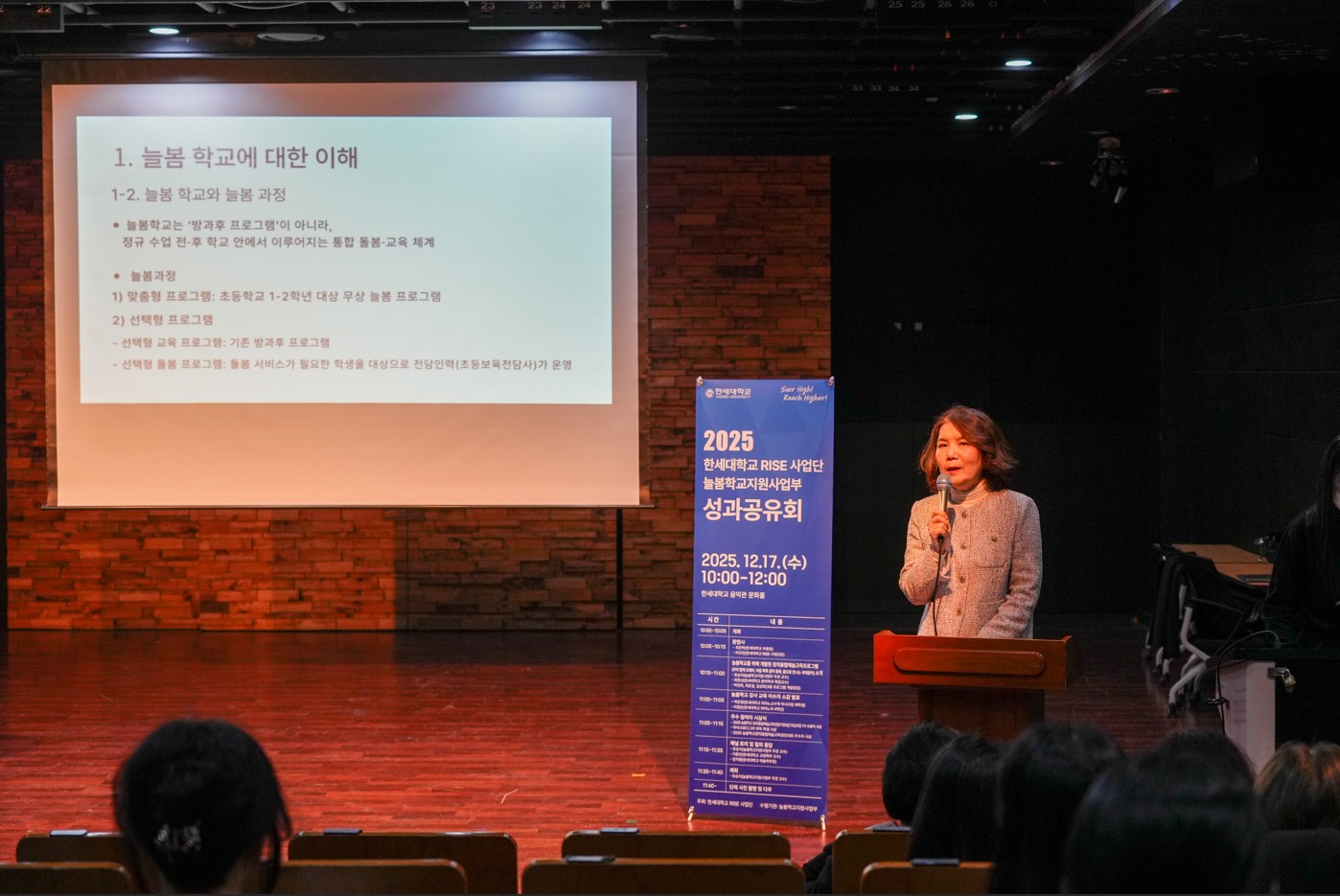[사진 5. 늘봄학교 지원사업 2025 성과발표회에서 발표하는 유승지 주관 교수]